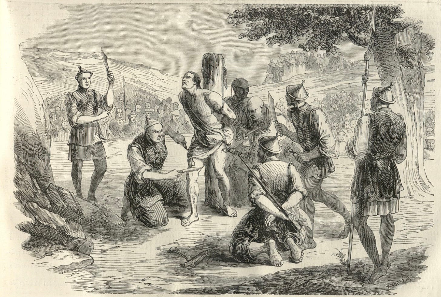 "[The executioner] grasping handfuls from the fleshy parts of the body such as the thighs and breasts slices them away ... the limbs are cut off piecemeal at the wrists and ankles, the elbows and knees, shoulders and hips. Finally the condemned is stabbed to the heart and the head is cut off."