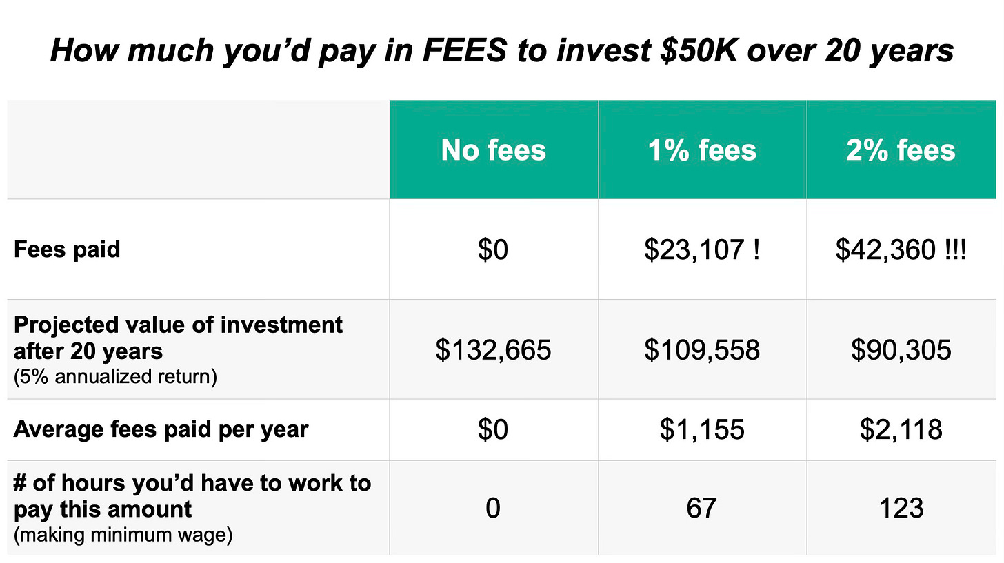 The sad reality is that (too) many Canadians are invested in mutual funds costing them upwards of 2% in fees every year (looking at you, Big Banks). This works out to over $40K in fees over 20 years in our hypothetical example above. Death by a thousand investing fees.