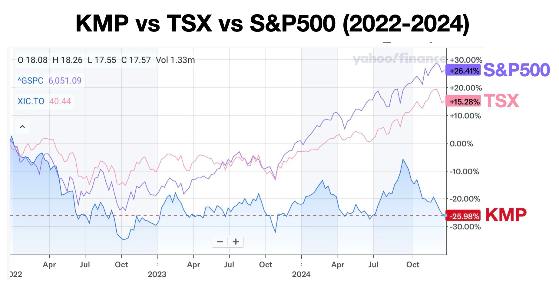 Fast forward three years, KMP is priced at $17.04 (as of December 23, 2024). My investment lost ~25% of its value, an annualized return of -9%.