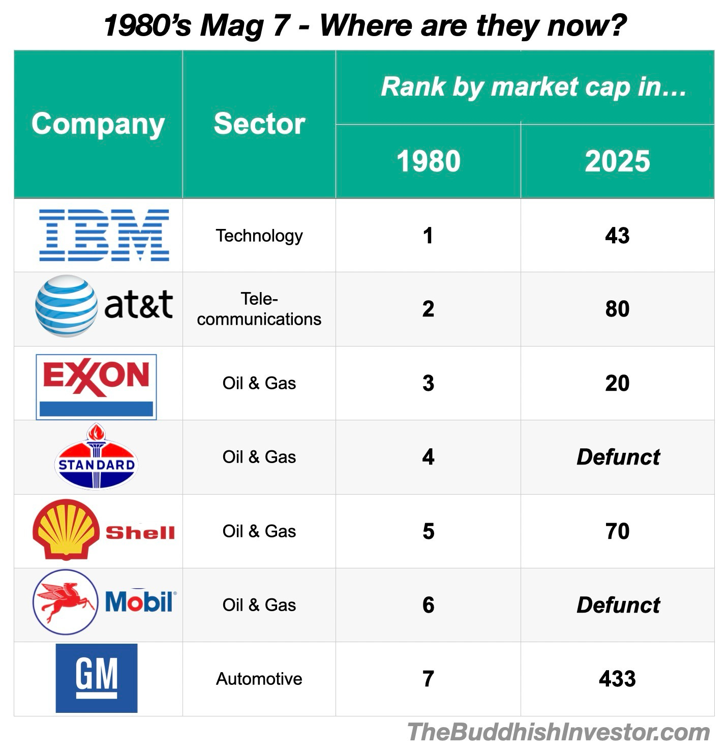 IBM, AT&T and the other “Mag 7”-ish stocks of the early 1980s probably looked just as unstoppable. But the party eventually ended, and they went from “magnificent” to “meh.”