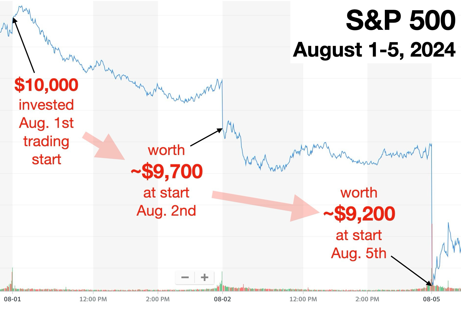 Think about how you’d have felt if you had invested your hard-earned cash into SPY, an S&P500-tracking ETF, at 9:30AM on August 1st, 2024. Over the course of two trading days you would’ve lost 8% of your money (with no telling what further carnage lay in store—fortunately things improved):