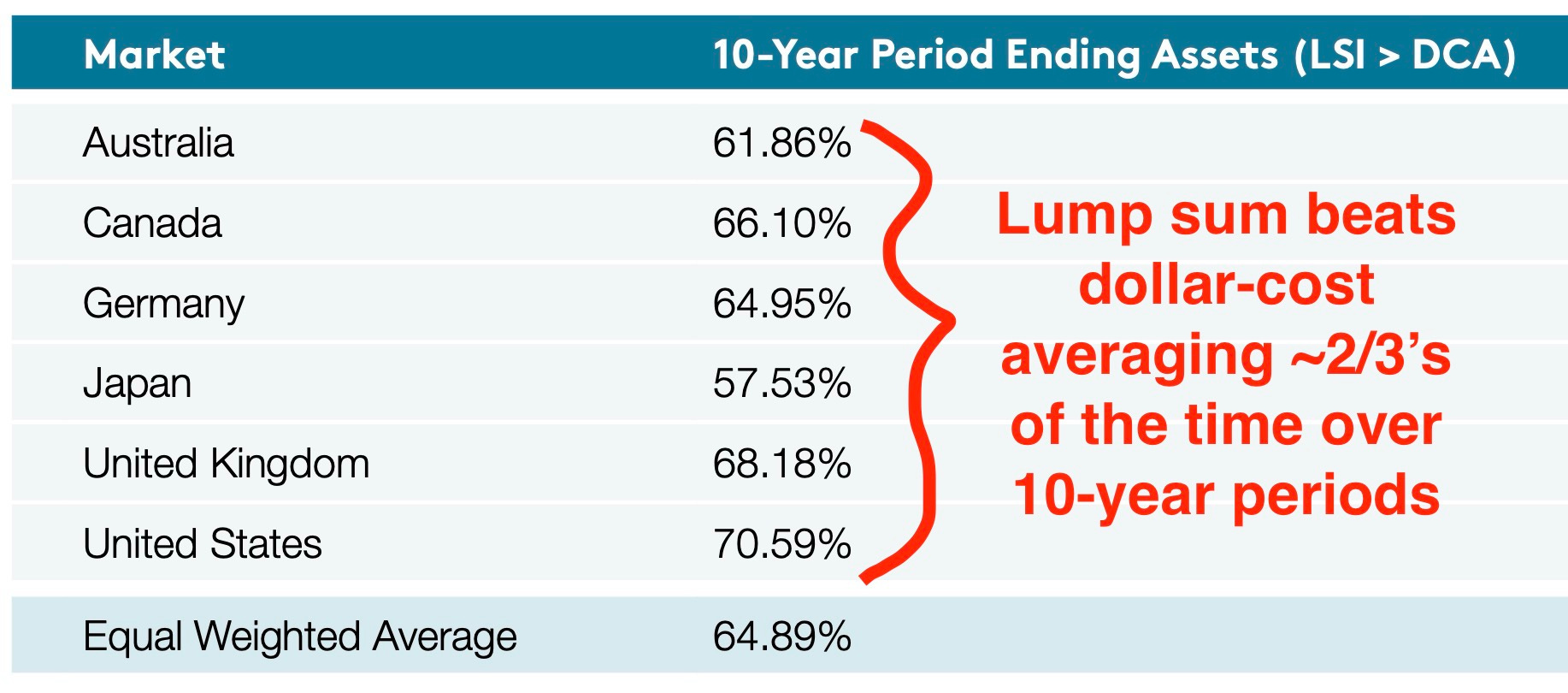 Lump-sum investing (LSI) leads to better long-term portfolio returns than dollar-cost averaging (DCA) about two-thirds of the time: